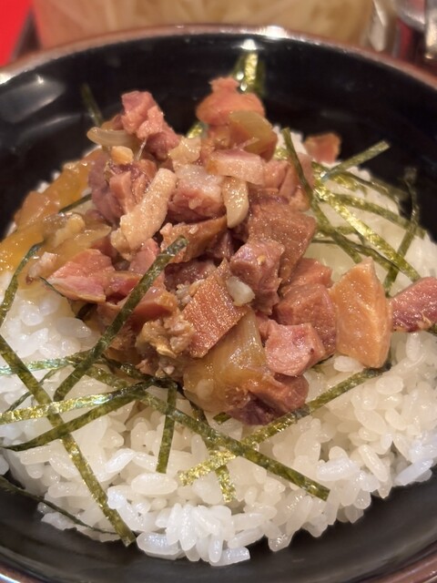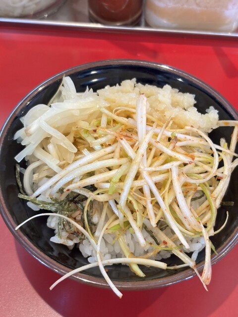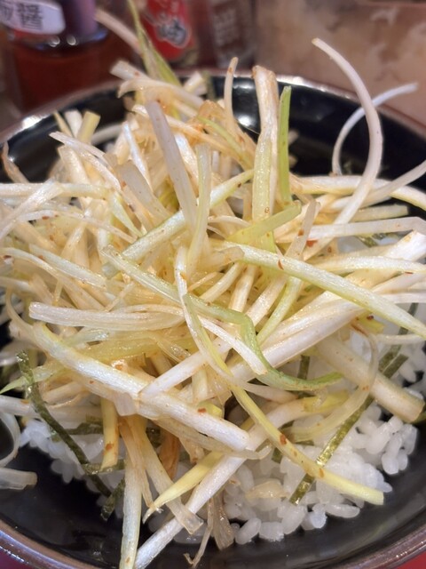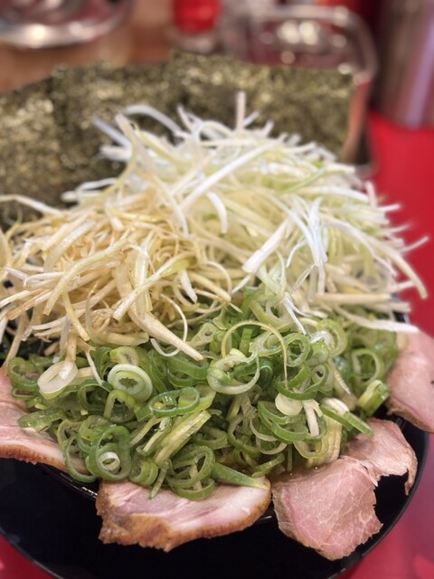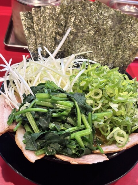 チャーシュー麺、チャーシュー増し、ほうれん草、きざみネギ、辛ネギ丼小、全部普通!