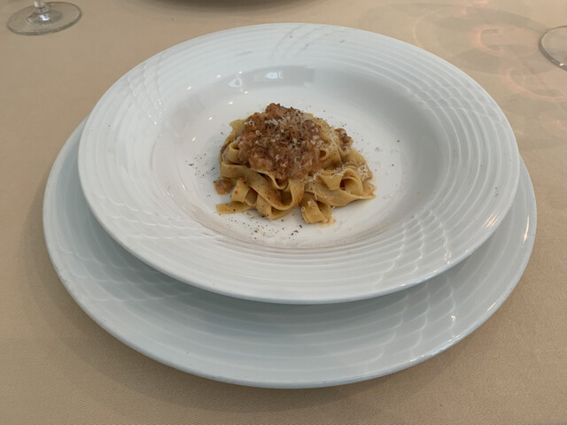 特に前菜の4種の乳を使った白カビのチーズ、魚料理の金目鯛に添えられた花ズッキーニのフリット、平打ちパスタのボロネーゼ、肉料理の比婆牛のイチボとホホ肉の煮込が絶品で、美味い