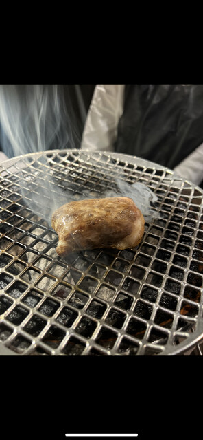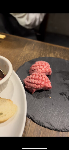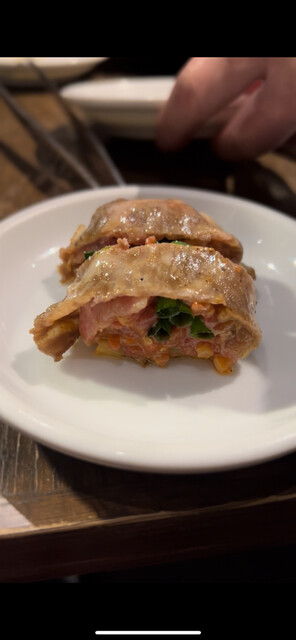 こちら、中にはなんとユッケが入ってます。それをサーロインで包んだものをさらに豚肉の網脂で包んだものがこれになります。トウカハナレさんの名物のようです。