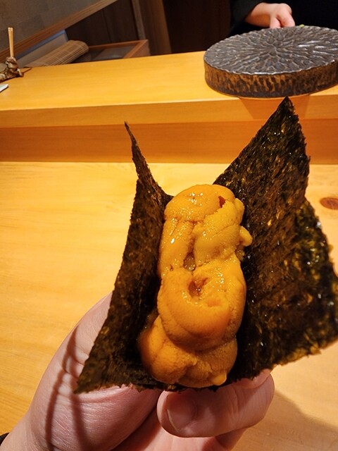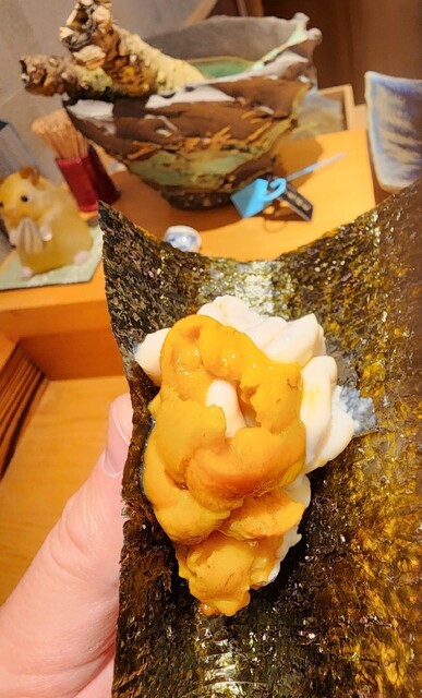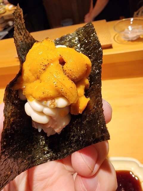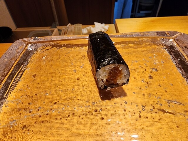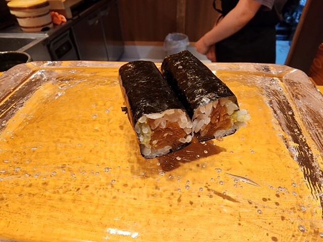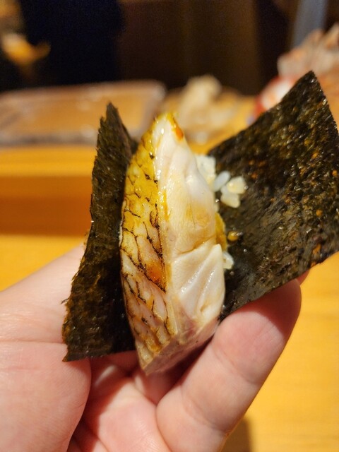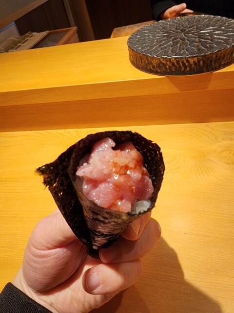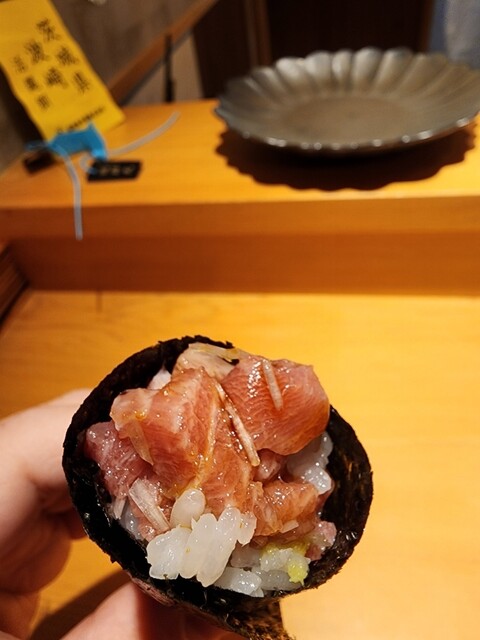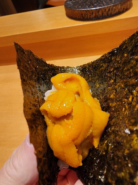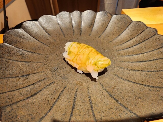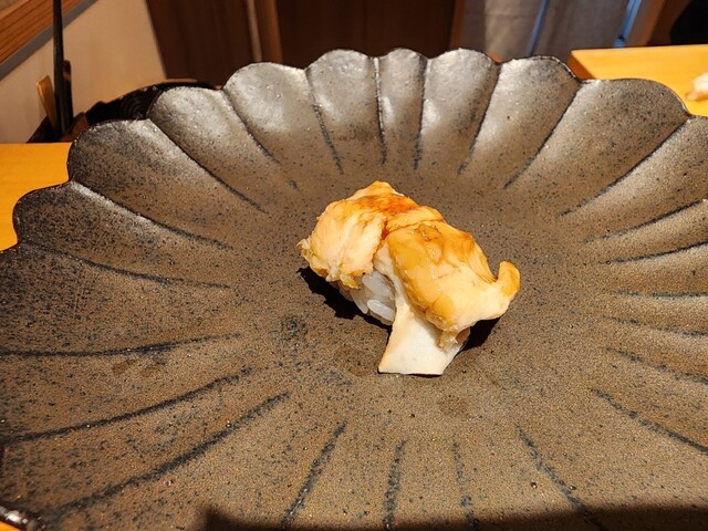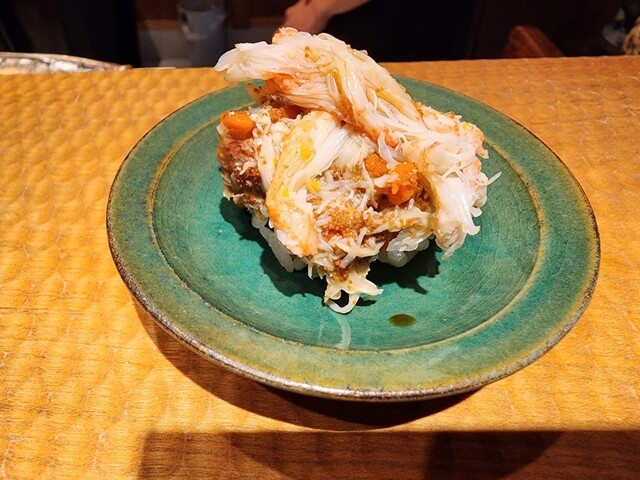 加能蟹は今回は手巻きでの提供でした。先月は握りで棒肉の上に蟹味噌で絡めたほぐし身がのっていました。