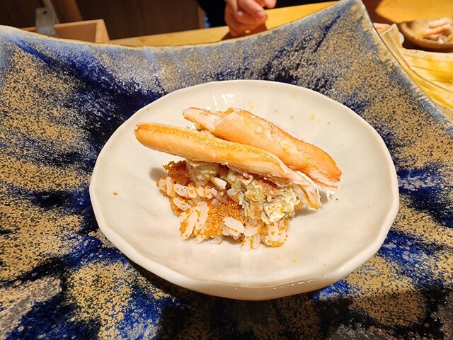 香箱蟹は酢飯に外子が混ぜてあり、その上にほぐしみ、棒肉。少しずつ食べていくのもいいですが、自分は心が子供なのでいつも全部、一緒に食べます…笑。至福の瞬間です。