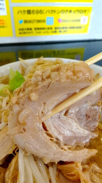最近ネット上で話題になっているこのお店。大館市内もラーメンの有名店が集まる場所ですが、本格的な二郎系を提供するお店と聞き、出張帰りに訪問してみることに。アーケードが連なる市内中心部から15分ほどの場所、道路沿いに黄色の幟がはためいていました。ワクワクしながら入店。カウンター席のみのお店です。流れる音楽、店内に飾られている写真やサインなど、店主さんはジャパニーズロックが大好きな方のよう。なるほど、それで696…ロックンロールなのか! バク豚はバク転?