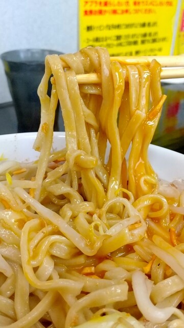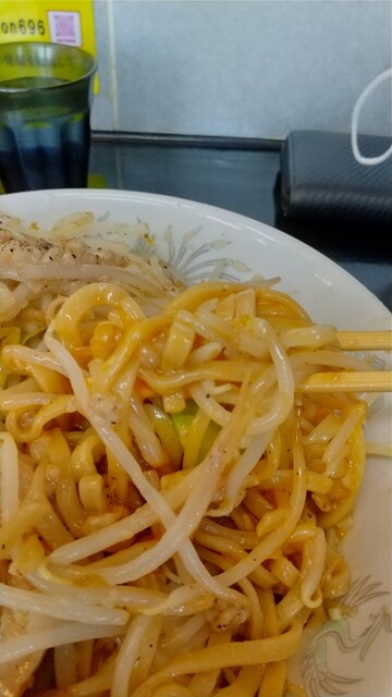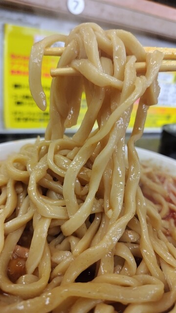 …平打ち気味の角太麺(極太と言うほどではない)は、加水率やや低め。噛み応えしっかりですがボソボソ感はなく、結構すいすいすすれます。そして荒くれ感アリアリのスープ…まんま二郎だ!これは二郎だ! 塩分はカラメにしたらちょっとキツめになってしまいました。卓上のカエシで調整したほうがよかったかな。