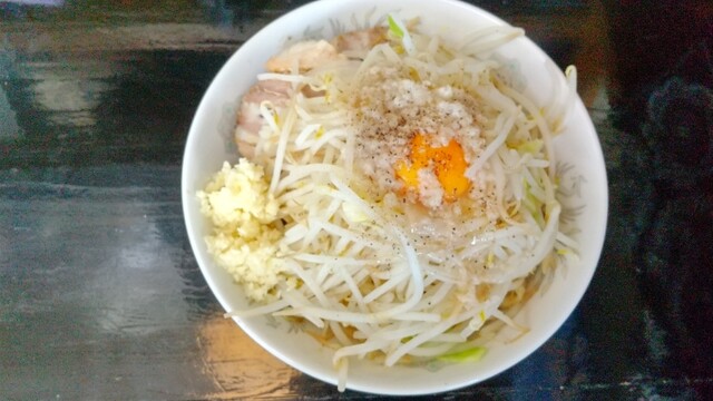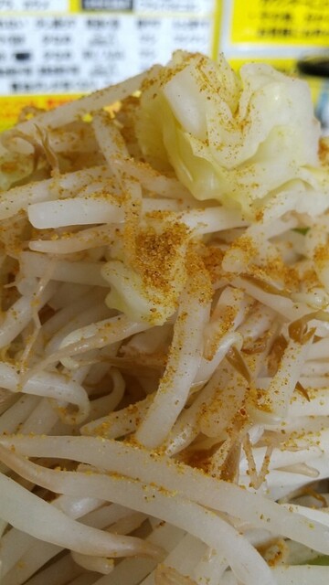 痛恨…白いモヤシの山の中央に卵黄、パラパラと散らされたブラックペッパー。至ってシンプルな丼容。白くて綺麗なのは姫路城だけで十分だよ…(涙) 隣の席の若いお兄さんもまぜそばでしたが、慣れたもので、オレンジ色のベビースターラーメンやフライドオニオンがヤサイの山肌を彩っていました。くううう…悔しい!