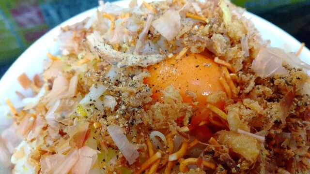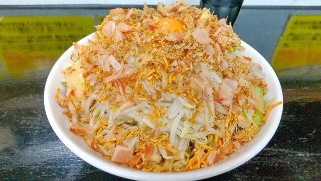 さあ着丼! フライドオニオン、ベビースターラーメン、そして花鰹のカラフルな飾りをまとった白いモヤシの山。頂点には卵黄! まずはヤサイにカエシを回しかけてバリバリと減らし、しかる後に混ぜ混ぜ、卵黄を崩して麺に絡める…! この日はややデロめの麺でしたが、パリパリのベビースターラーメンと絡んだ時の食感がまたいい!