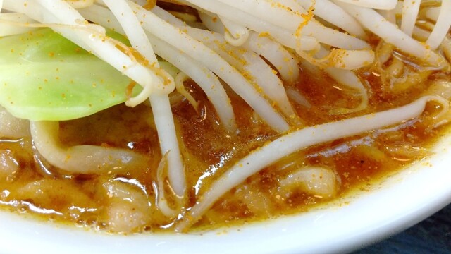 カレースープバージョンの「GOLD」に、激辛ソースをトッピングしているのをSNSで見かけました。ラーメンも¥1000超が当たり前になってきて、トッピングでは贅沢しないことにしているワタシですが、今回は心惹かれて頼んでみました。バク豚ラーメン大¥1000+激辛ソース¥100。待合席まですべて埋まる繁盛ぶりでしたが、ロットは順調に進んでカウンター席に着席、ヤサイマシマシ・ニンニクマシをコール。しばらくして着丼!