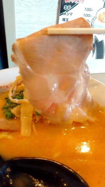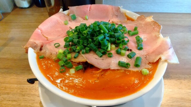 さあ着丼。マットなオレンジ色のスープが目を引きます。まずはレンゲでひとすくい…おお、魚介臭さのない、かなりしっかり目の海老フレーバーが直撃! 「羅漢」のスープは、カリッと焼いた海老の殻を粉砕してそのまま使っているため、結構ジャリジャリ感があるのですが、こちらはそれは皆無で雑味がありません。味噌濃度もちょうどいい。その分厚いスープがプリプリの多加水中太ゆるウエーブ麺にしっかり絡み、これが美味しいこと!