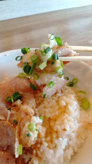 チャーシューライスは薄切りのチャーシューに醤油だれがかけられています。見た目よりも量があり、こちらも美味しい。レンゲで海老スープとごはんを合わせると、これまた美味し。スープが濃厚な分、白いご飯オンリーでもよかったかな?