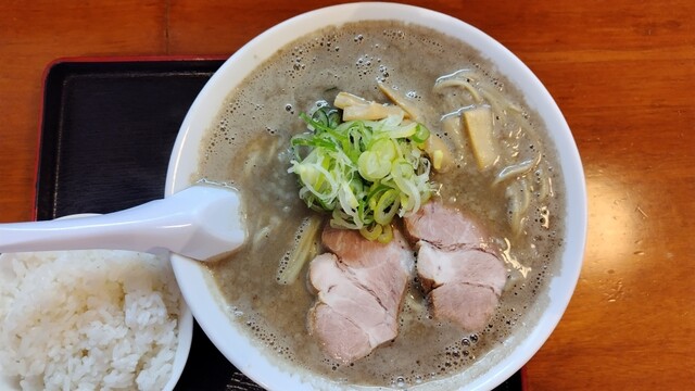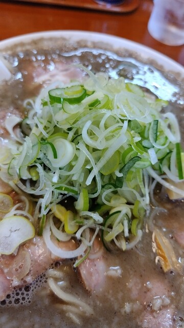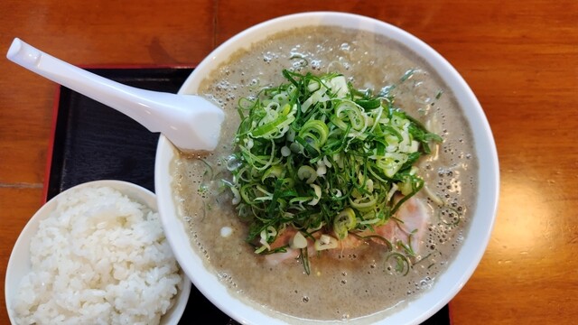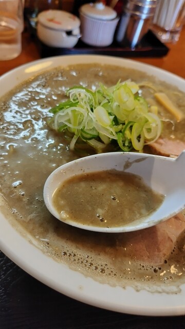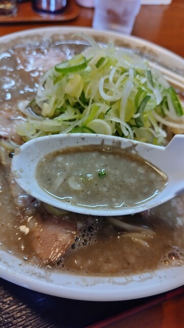 背脂多めのタプタプ感が見ただけで分かる、美しい灰褐色のスープ。丼中央のこんもりネギの鮮やかさが際立ちます。ではいただきます!