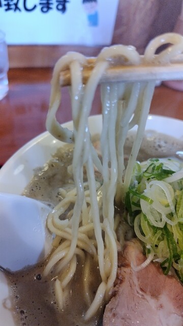 さあ着丼!泡立つ灰色がかった水面、水際の細かい粉っぽさは煮干しラーメンの証。間に間に白い背脂がたゆたっています。ではスープを一口…。うん!デフォルトより明らかにコクと旨味が深く感じられる、やや粘度強めの完飲必至なヤツ。