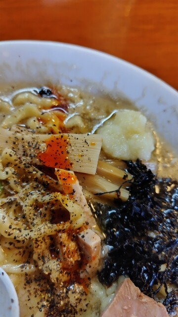 鮮烈に赤黒い辛みが中央に鎮座、デフォルトの煮干し中華にはない岩海苔も配されています。水際の泡立ちは煮干しスープの証、不透明なのはしっかり背脂が効いている証。もう食べる前から大勝利が約束されている丼容。いただきます!
