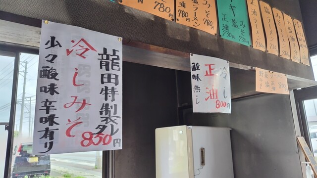 能代松陽高校の目の前にあるお店。色あせた赤地の看板に「ラーメンたつた」の文字が。ああ、変わってない…。赤い建物に黒の暖簾が印象的ですが、それよりも、扉や窓が完全開放されている…ってことは、30℃超の気温、冷房がない中でのラーメン! ワイルドなシチュエーションですが、なにせ7年ぶり。突撃するしかありません!