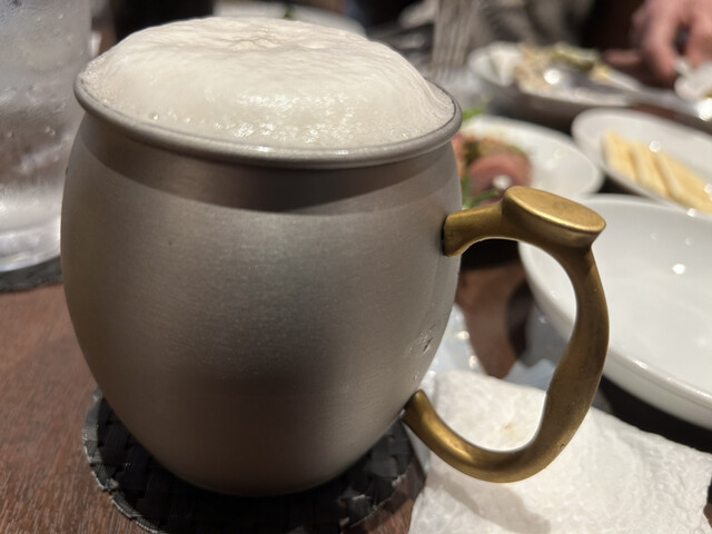 今年も1月も終わり2月に突入しました。大好きな先輩方との「ちょっと遅めの新年会」を開催。三々五々に店舗前に集合。先ずは「銅マグのスーパードライ」で乾杯。シャルキュトリーと野菜スティックでスタート。前菜は大好きなリェットとパテ最高。そこに箸休めのフルーツ良いよね。季節感も醸しだしていて…野菜たちは皆みずみずしくそのものの甘みや香りがダイレクトに口に広がる。添えてあるディップ(おかわり自由)も美味し。