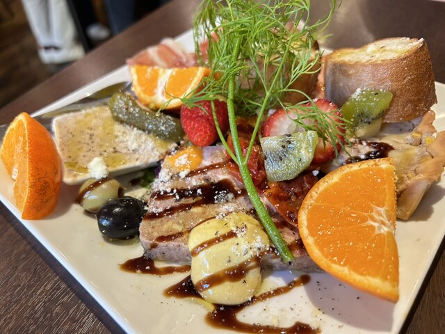生ハム・パテドカンパーニュ←最高・松阪ポークのリエット・季節のフルーツ(柿・梨・無花果)・キッシュの「シャルキュトリー(前菜盛り合わせ)」