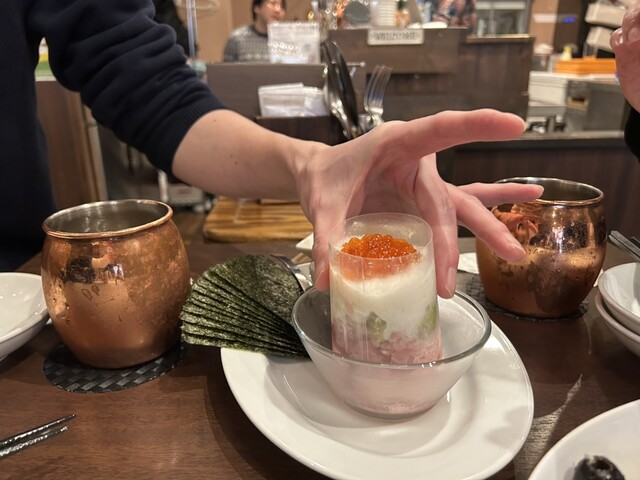 先ずは、冷え冷えの「銅マグ」スーパードライで乾杯初の「薩摩灰干しサバのリェット」コレサバ好きにはたまらん逸品やぁ。「牛乳のシレネ(塩漬けチーズ)とトマトサラダ」コレまたシレネがめちゃくちゃ美味しい。バルサミコとの相性もバッチリ「佐賀牛リブロースの炙り」軽く炙ったリブ。葉わさびと塩・レモンが添えられているけど、下味の塩だけで肉の旨みが伝わってきて美味しい「カウアイの宝石」はグリルで…素手でほうばる。頭はカラッと揚げて再登場食べ残すことなくいただく。