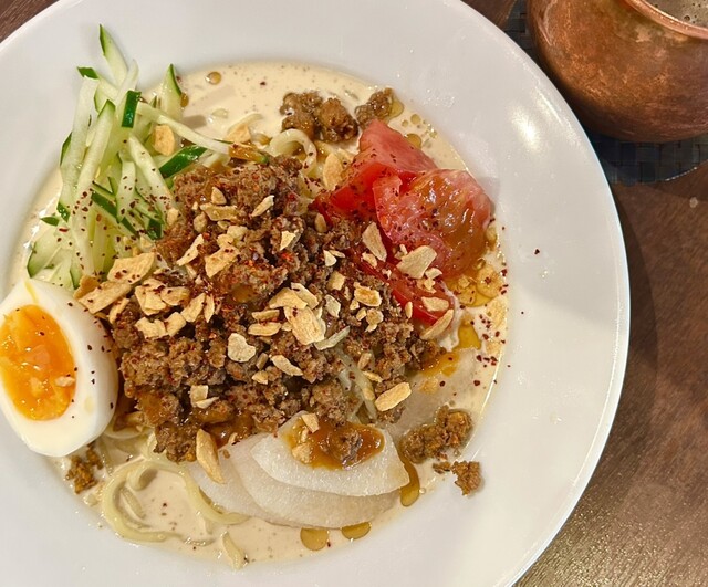 トッピングに、肉味噌・半熟玉子・トマト・サッパリ感を醸し出してくれる「梨」めっちゃ美味しくて完食。スープも完飲。ご馳走さまでした。