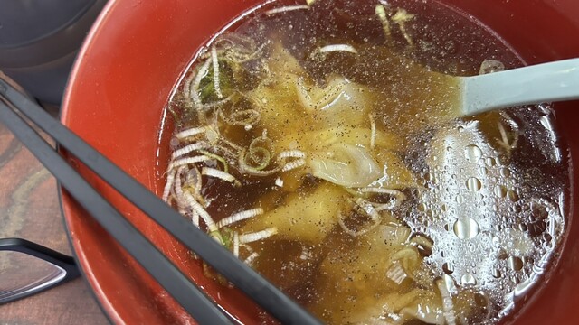 早々に着丼。ラーメンの麺がご飯になった丼。トッピング具材も、焼豚・支那竹・もやし・ネギ付属のタレに辛子を溶いて丼にぶっ掛け混ぜまぜで完成です。スプーンでガッツリ口にはこぶ。まるでラーメン丼です。本来ならスープ付きですが+ワンタンにしたので少し大きめの器にワンタン6個スープに変身。