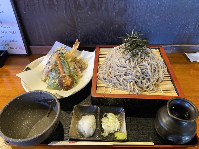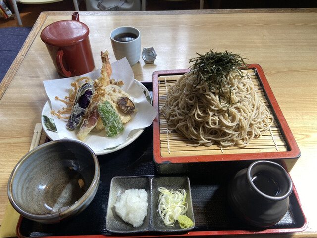 大天ざる蕎麦が気になり利用しました。写真から分からないけれども、お蕎麦が500gにえび天と野菜天合わせて10品で1,900円です。常陸秋蕎麦だから風味良し、喉越し良しでいうことなしです。ひたちなか市のお気に入りの蕎麦屋です。