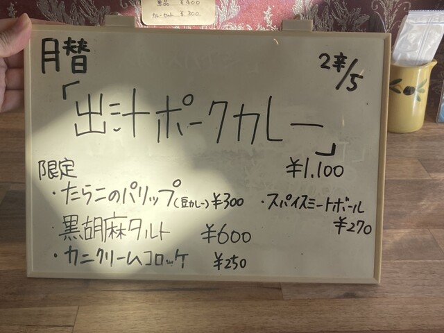 2か月に一度行くのが、月替りカレーが食べたくなって毎月行くのが楽しみのお店。いつものように2種あいがけカレーを注文して、トッピングはたらこのパリップを注文。スパイシーだけれども辛さが欲しい場合には、七味唐辛子をかけて辛さを調整。美味しかった。スィーツも頼めば良かった。