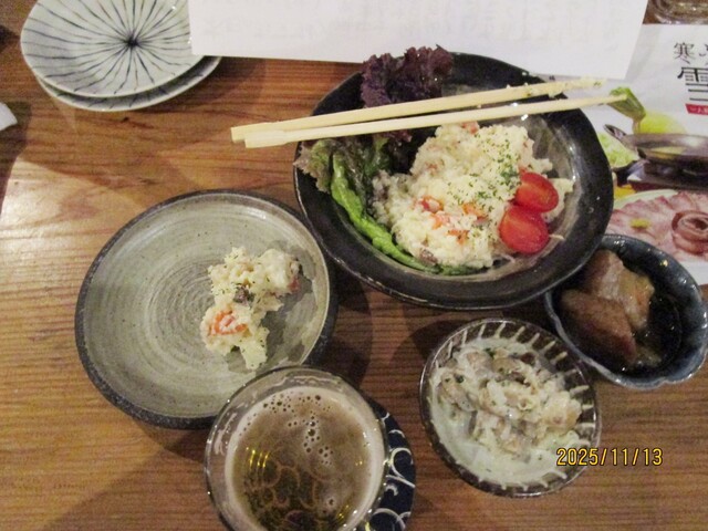 ①牡蠣ポン酢、②白子ポン酢、③里芋から揚げ、④中津から揚げ、⑤馬肉赤身、⑥炊き餃子、⑦〆のチャンポン