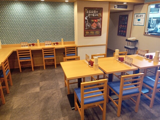 チェーン店にも関わらず店内はうなぎ店らしく、高さを揃えた木の机椅子で統一。