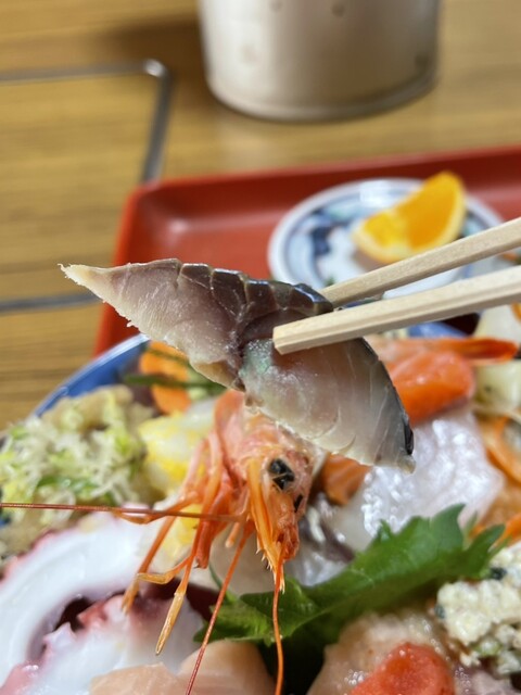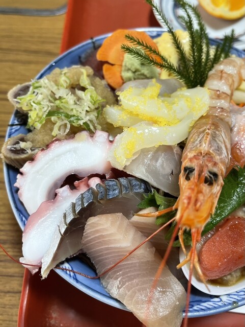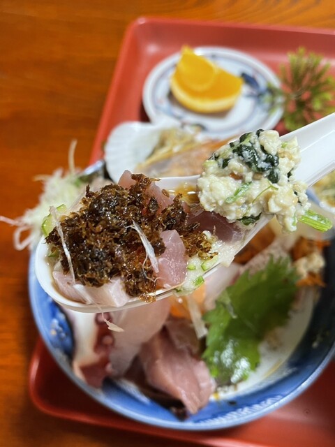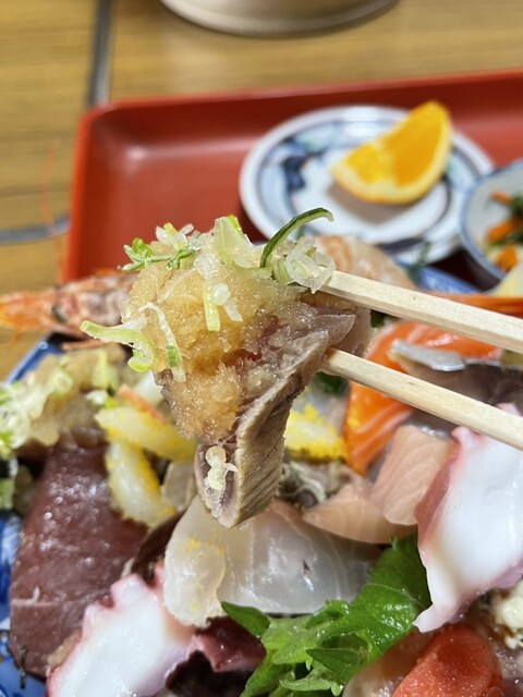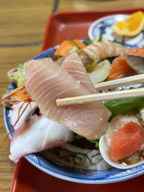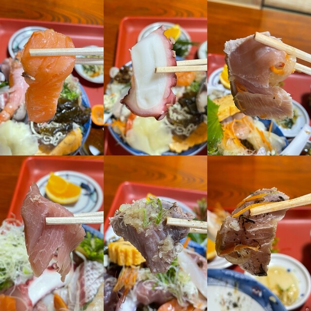 マグロ、ホタテ、ノドグロ、鯛、サーモン、赤海老、カツオ、タコ、マグロの山かけ、イカなど10種類以上の大きめな切り身が乗ります。