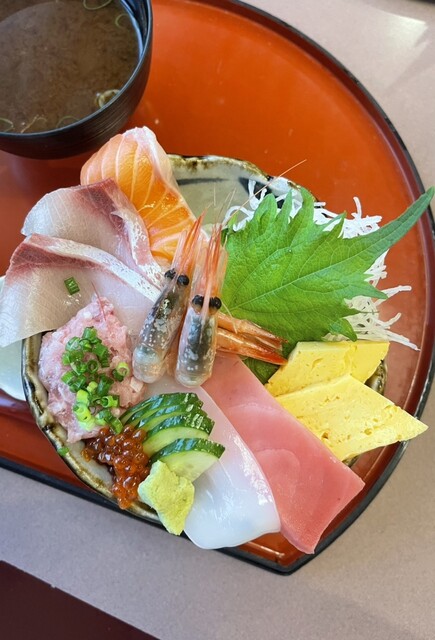丼からはみ出す程大ぶりの新鮮なお刺身たっぷりの海鮮丼にはイクラまで乗っており、贅沢な仕上がり。