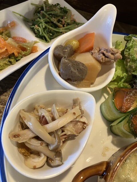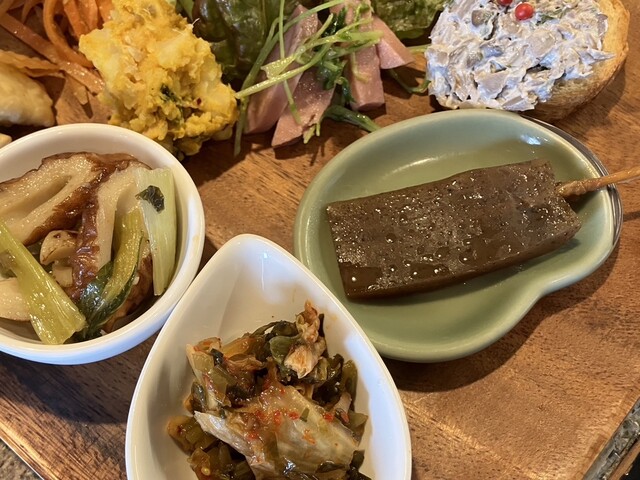 先ずは前菜3種盛が到着しました。香草類が苦手なため「セロリと菊芋のきんぴら」は食せないと思いながら、口に運んでみたところ、とびっことの相性が良かったのか、まさかの完食となりました。そうこうしている内にメインプレートが到着しました。和風煮込みハンバーグは、かぼちゃ・蓮根・椎茸が具材の和風餡掛けソースで煮込まれてます。半分に切るとふわふわ・アツアツでした。さぁいただきましょう♪