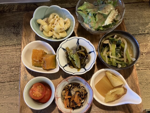 牡蠣と海苔のグラタン、前菜6種、味噌汁