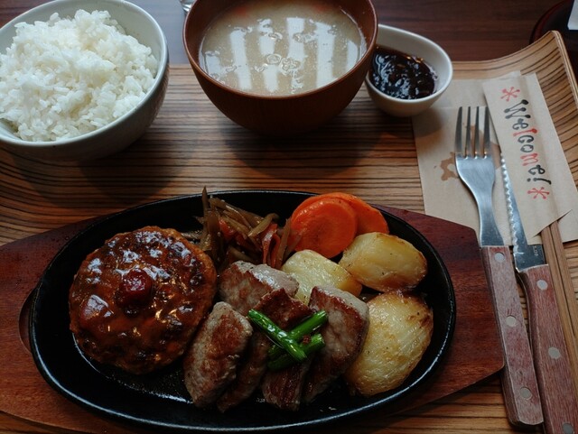 初めて行きました。入店したら、ジップに出ているアナウンサーに似た感じのめっちゃ対応の良い店員さんがオーダーを聞きに来て、頼んだのが、ステーキとハンバーグステーキとダークローストとレスカです。