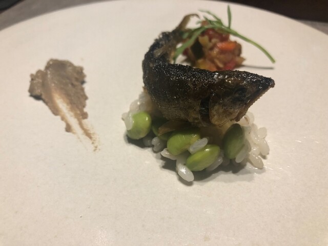鮎のコンフィ。頭から全部食べられる。ワタの苦みと身の旨味が同時に口の中で広がる。貝の出汁で作った枝豆のリゾットを鮎のワタのソースで食べると絶妙。