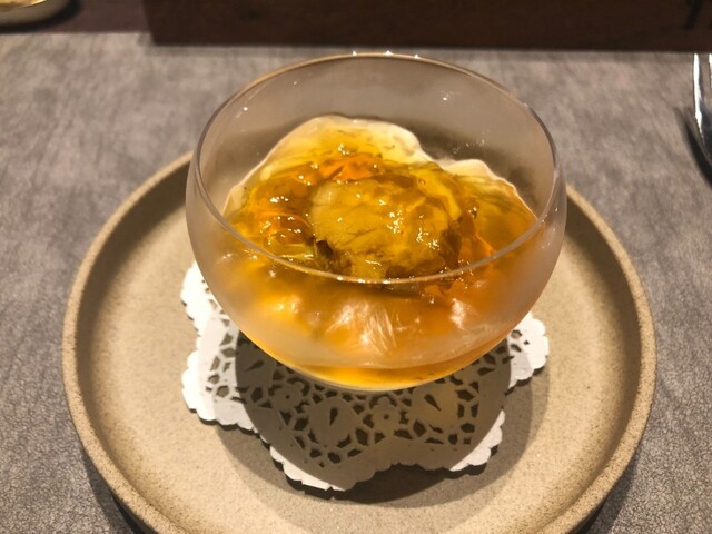 コンソメのジュレで長時間しっかりと出汁を取ったスープの中に雲丹、毛ガニが入っていて美味しい。コンソメはフレンチの出汁の基本になるが適当に作っているシェフも多い中、丁寧な調理が好感を持てる。