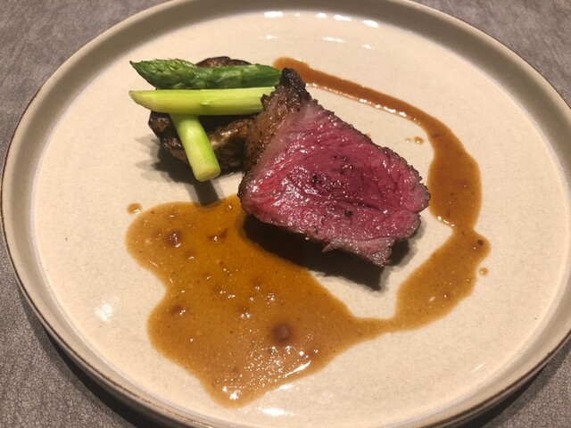 都萬牛のイチボのロースト。やはり肉は赤身がいい。そう思わせるに足るジューシーでありながらしつこくなく、肉が甘い。グリルした白ナス、アスパラが添えられるが、夏野菜の旬の濃厚な旨味がしっかり出ている。エシャロットソースがこれまた全体的に皿の味を引き上げる。