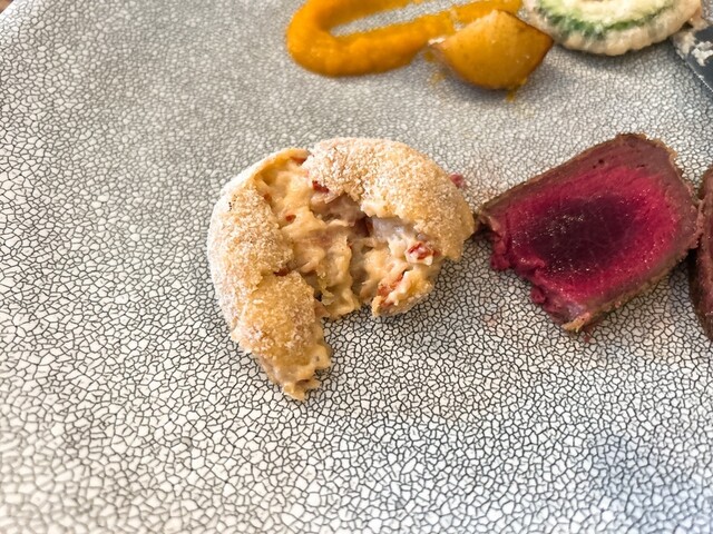 コロッケは一般的な揚げ物のイメージとは異なり、極めて薄く細かな衣で中のクリームを包む仕立て。サクサク感を強調するというより、クリームの質感と素材の風味を主役にした一品。