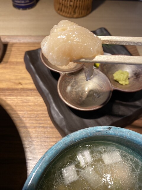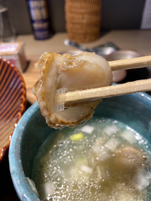 こちらが食べ終わる頃に、サッと準備して頂きました。汁に入れる前に、そのまま飲むと削り出しの味がありながらも、最後にはほうじ茶がふわっと落ち着く味。ホタテつけ汁に入れると深みが非常にまします。