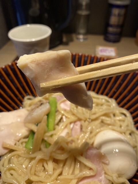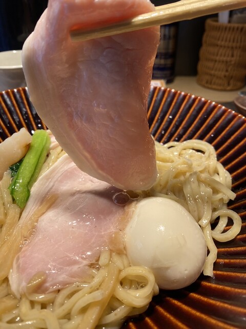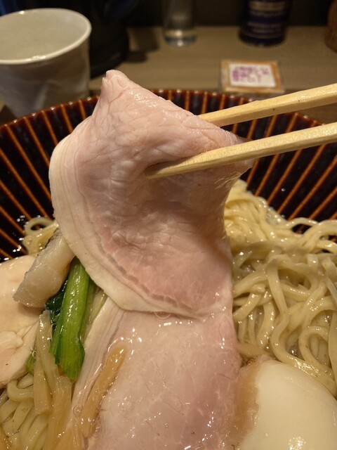 そして特製のトッピングの豚チャーシューは低温調理されてレア感がしっかりありますし、鳥チャーシューは淡白でありながら柔らかく、味玉の半熟さも美味しいです。