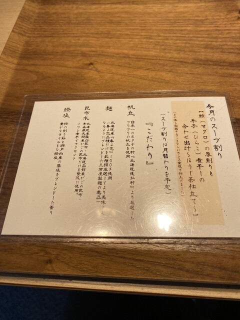 今月の月替わりの割スープは[鮪の厚削りと平子の煮干のほうじ茶仕立て]でした。