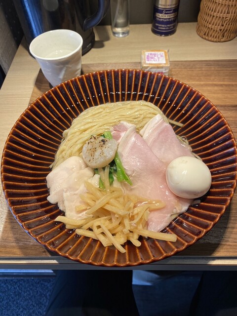 15分ほど前に到着し、程なくして、券売機にて特製帆立の昆布水つけ麺(塩)(¥1,600)と大盛り(¥150)を購入。