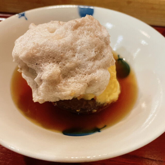 メレンゲのような海老しんじょに大きめの椎茸。あんかけの味付けも絶妙で優しい味付け。