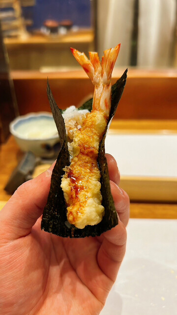 みやしろ名物のひとつ【海老天海苔巻き】はみやしろ監修として「おにかい」系列の鮨屋でも口にできる。私も「野毛のおにかい」でこちらを口にして以降、ずっと”天麩羅 みやしろ”の名前を覚えていたので”みやしろ“で実際に食べられるのが嬉しかった。パリッとした海苔に海老天、とろりとした濃くて甘い秘伝のタレが形容。