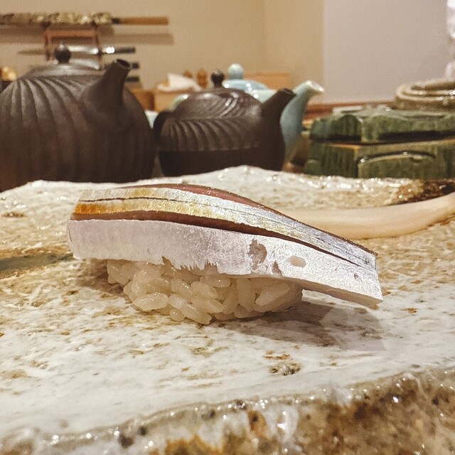 鮮度の高さを感じさせる強い弾力のある【車海老】や濃厚な甘みと旨みが渾然一体となりあとを引く味わいの【ウニ】を経て、7貫目は光り物の【さんま】だ。切りつけた身から覗く宝石のような淡いレッドが美しい。旬ということもあって脂が米粒に重なり食べ終えたあともしばらく余韻に浸れる握りだった。