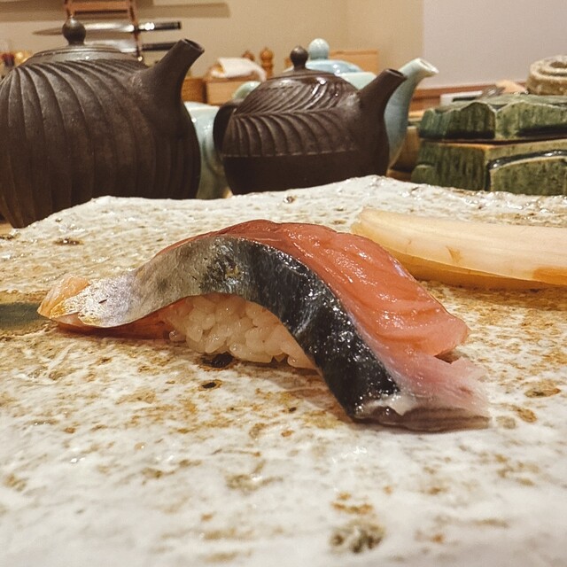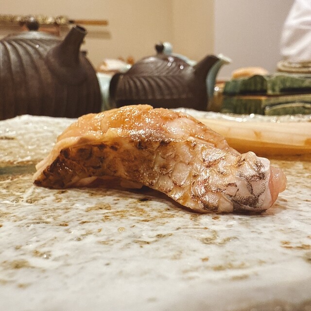 続いて二貫目は【のどぐろ】。こちらは炙られることにより脂がより引き立つので食べ終えた後の脂による余韻と一貫食べたとは思えぬ充足感。それとは対比するように【メイチダイ】は昆布〆めでねっとりとした食感を感じられるので違いが分かりやすかった。