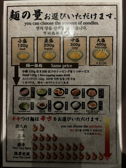 食券を買うと、近くに待機している店員さんが麺の量と辛さを聞いてくれたので、味玉辛辛つけ麺の中盛り(300g)、辛さ控えめをオーダー。
