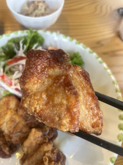 唐揚げはスパイスが効いており美味い!御飯が進む味付け。しっとりとしており食べ応えがございます。肉も非常に柔らかで美味い!
