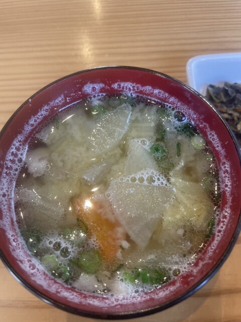 あっという間に御飯をたいらげると、まだ唐揚げが3切れ程残っており小ご飯を追加オーダー。うーん美味い。また豚汁も白菜、こんにゃく、豚肉がふんだんに入っており大満足。
