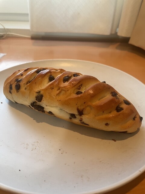 長い棒状のパンに斜めに細かいクープが入ったパンで、チョコチップがこれでもかと練り込まれたパンです
