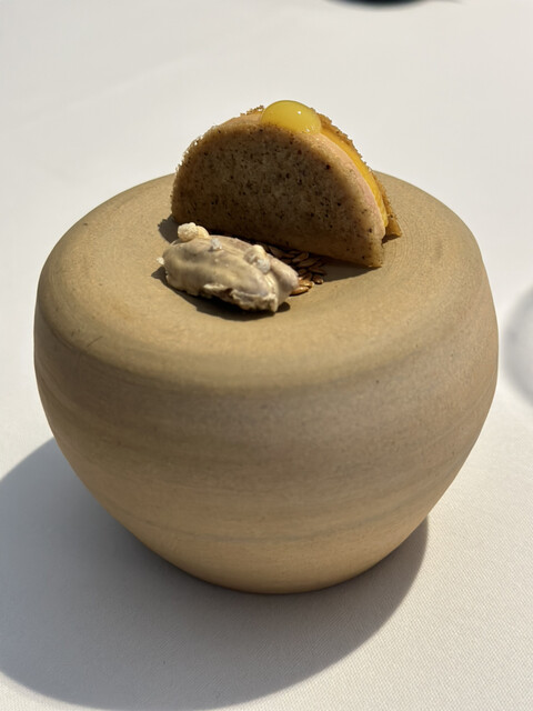 メニューにはない、フォアグラと宮崎産マンゴー ローストしたアマニ コーティングされたピーカンナッツ 美しいし美味しい ヌーディな色彩感覚も好み
