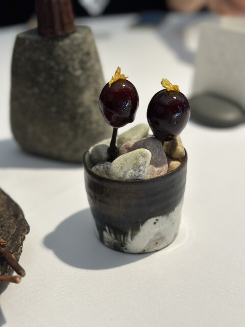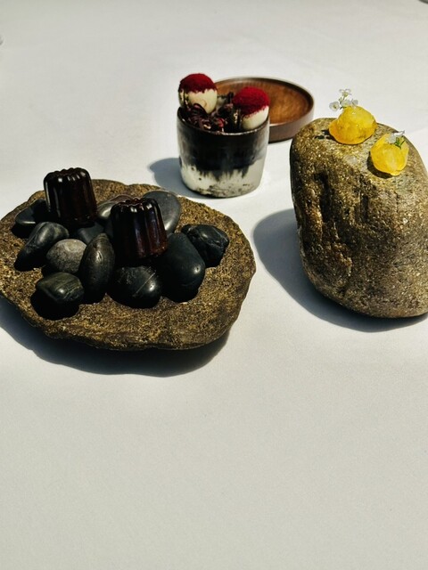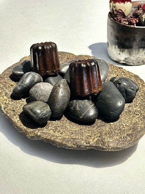 熱々の石の上に焼き立てのカヌレ、柔らかく焼き立て感を楽しみました。フランスボルドー地方の伝統菓子、〆に相応しい焼き菓子。