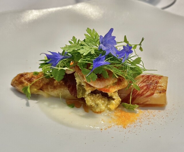 芸術的な前菜 アリウムスター ピーテンドリル(スナップエンドウの新芽部分(つる)だけを収穫したもの)が上部を彩っています 動きのあるつるは、効果抜群の緑 風を感じました。