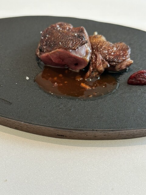 葛原シェフスペシャリテのひとつ 。もも肉、胸肉、砂肝、心臓を お肉の出汁を煮詰めて作ったソースで。